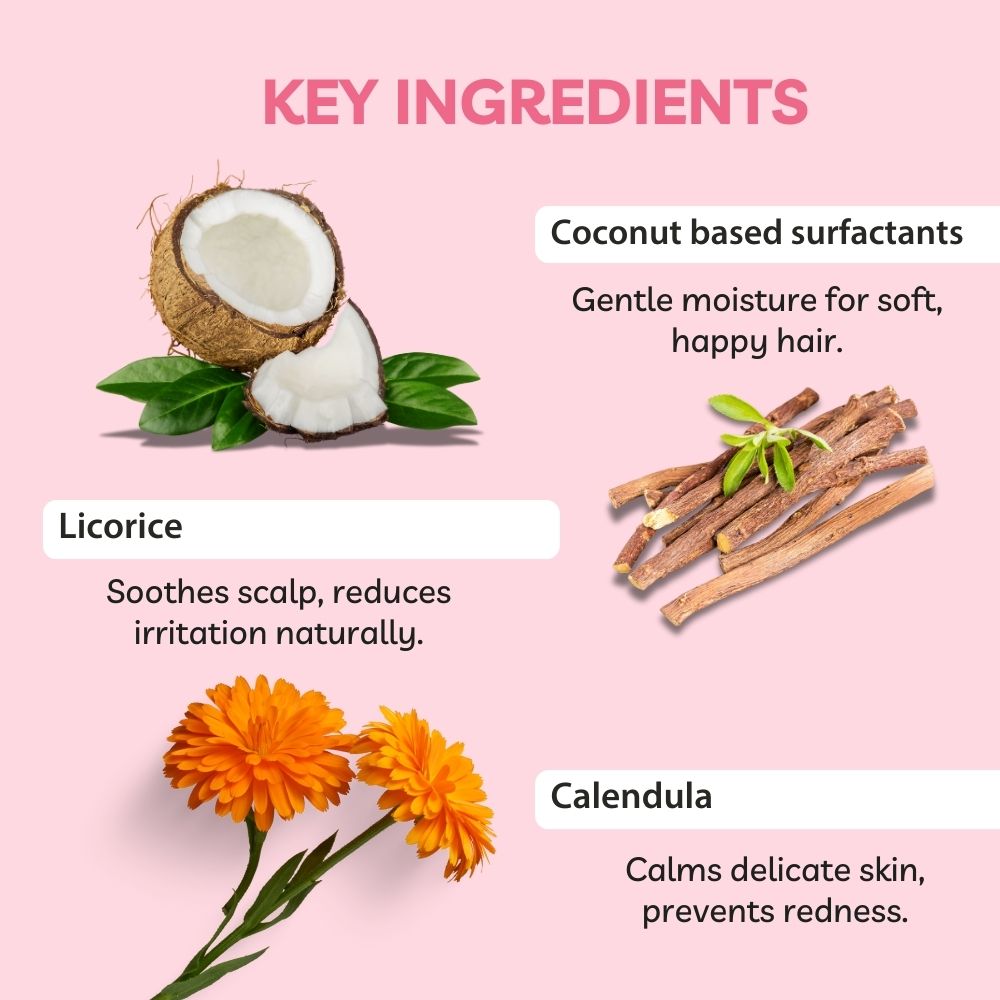 This product is 96.19% Natural origin*. The percentage of non-natural is shown in brackets against respective ingredients: Aqua, Disodium Cocoyl Glutamate (0.16%), Cocamidopropyl Betaine (1.12%), Disodium Cocoamphoacetate (1.14%), Glycerin, Coco Glucoside, Sodium Cocoyl Isethionate (0.42%), Xanthan Gum, Glyceryl Oleate, Panthenyl Hydroxypropyl Steardimonium Chloride (0.19%), Acacia Senegal Gum, Calendula Officinalis Flower Extract, Polyquaternium-10 (0.2%), D-Panthenol (0.2%), Aloe Barbadensis Leaf Juice, Sodium Gluconate, Citric Acid (0.1%), Glycyrrhiza Glabra (Licorice) Root Extract. Preservative: Gluconolactone (and) Sodium Benzoate (0.38%), Propylene Glycol Caprylate. *Rated as per ISO 16128.