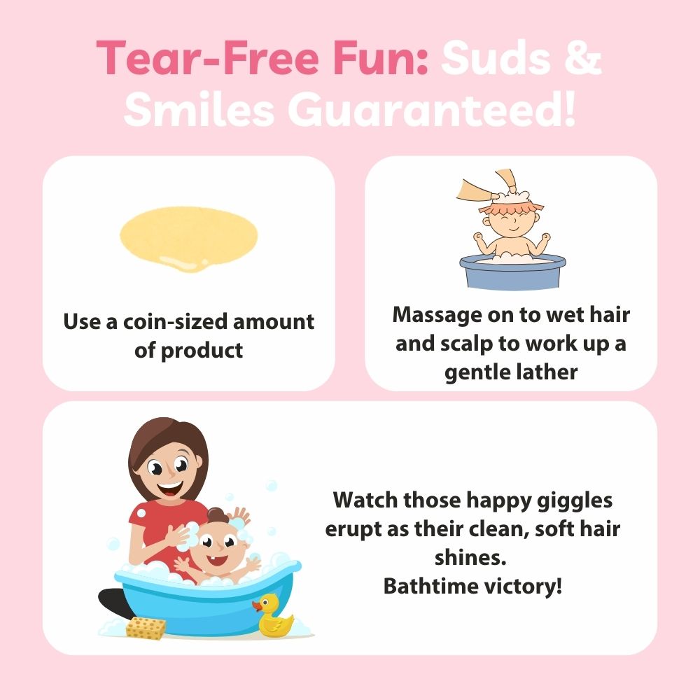 Apply a coin-sized amount to baby’s wet scalp/hair and gently massage to cleanse. Rinse-off well..