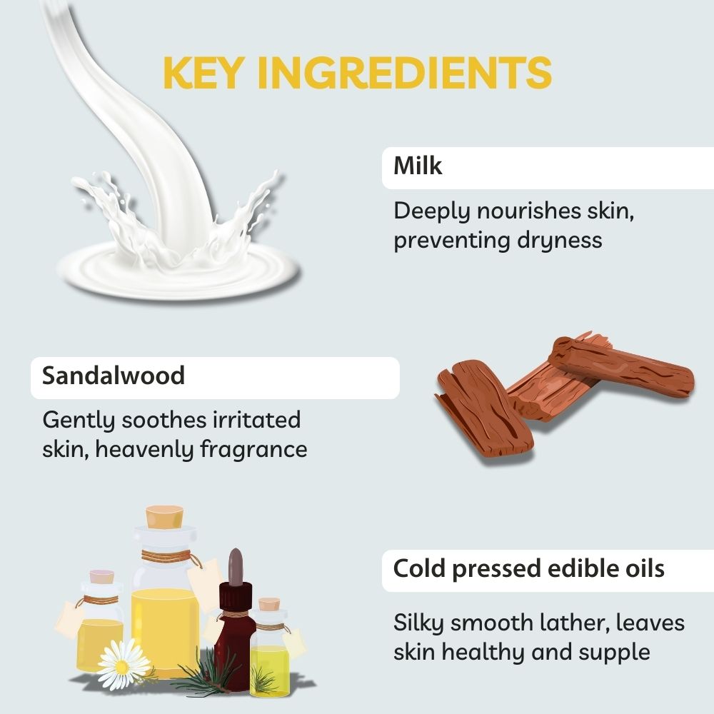 Cold-pressed edible oils, Desi cow milk, turmeric, and sandalwood — 90% natural origin, zero nasties, all love