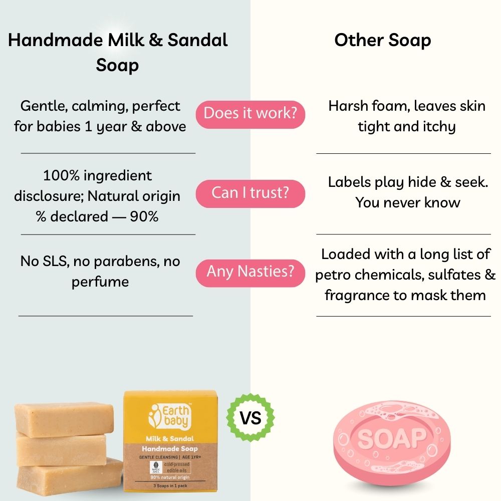 This handmade bar brings together edible oils, turmeric, sandalwood, and fresh cow milk — the kind of ingredients grandma would smile at. No sneaky stuff. No drying detergents. No itchy aftermath. Just soft, happy skin and a sweet, calming scent that smells like warm hugs.