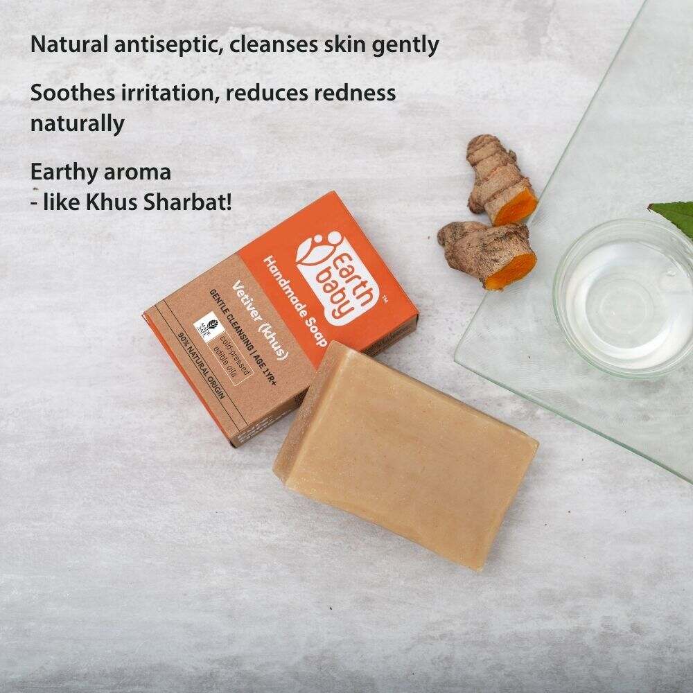 The soap is crafted with natural vetiver (khus), nourishing oils and tumeric, perfect for gently cleansing and nourishing your child's delicate skin. Vetiver and tumeric are powerful, yet gentle antioxidants, antibacterial and anti-inflammatory agents and the oils maintain the skin's moisture balance.