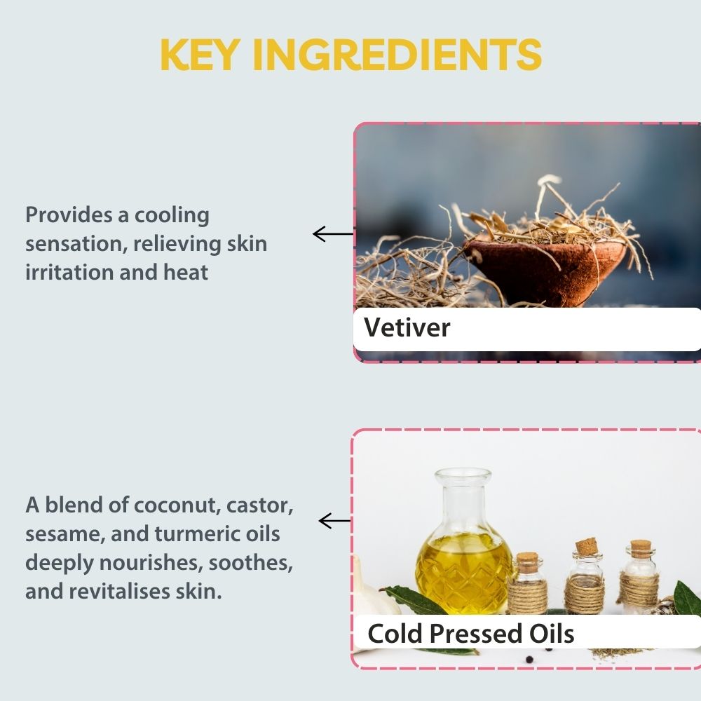 Cold-pressed edible oils, Vetiver root oil, Turmeric, rainwater — all skin-loving, no suspicious extras