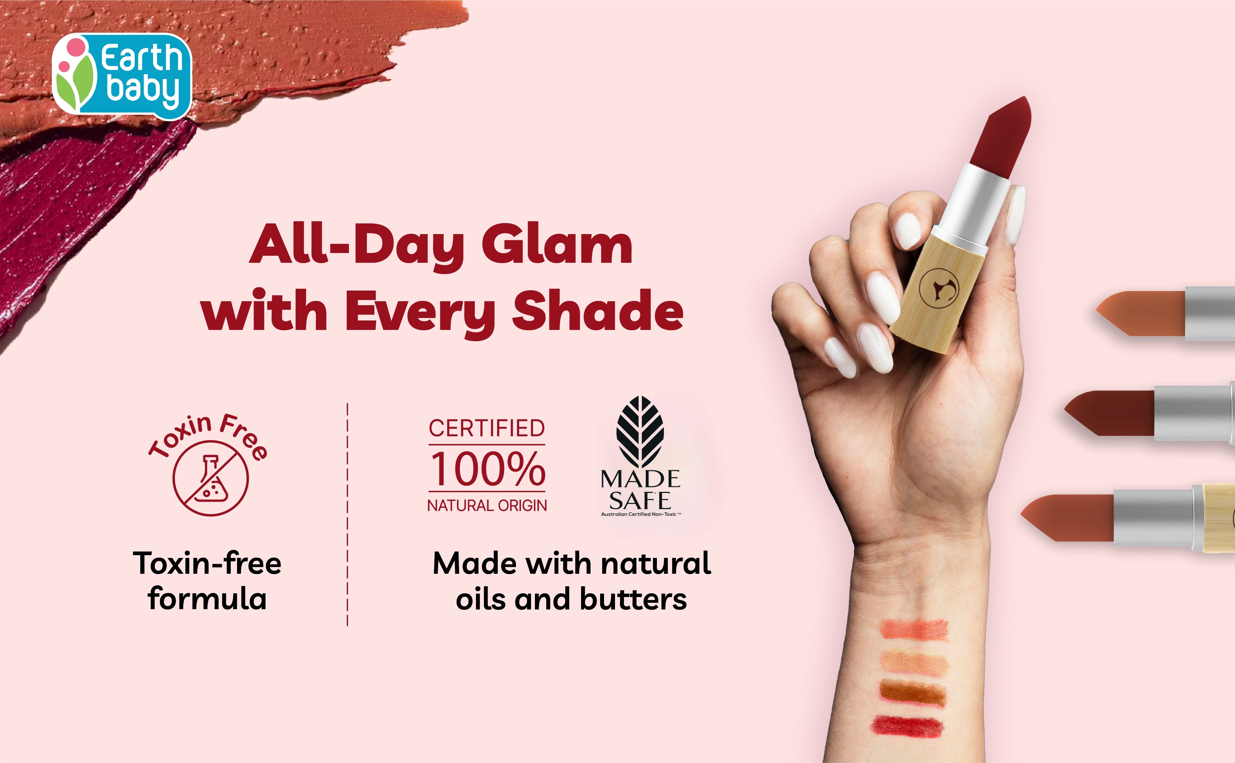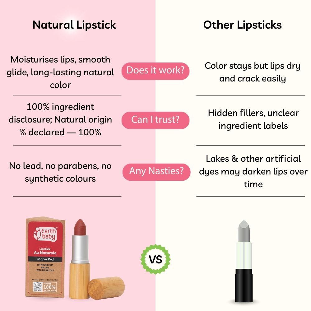 Earthbaby's Lipstick Au Naturale is 100% natural and made with nourishing ingredients like castor oil, coconut oil and shea butter. It provides natural moisturization, shine and excellent colour pay-off that suit all Indian skin tones.