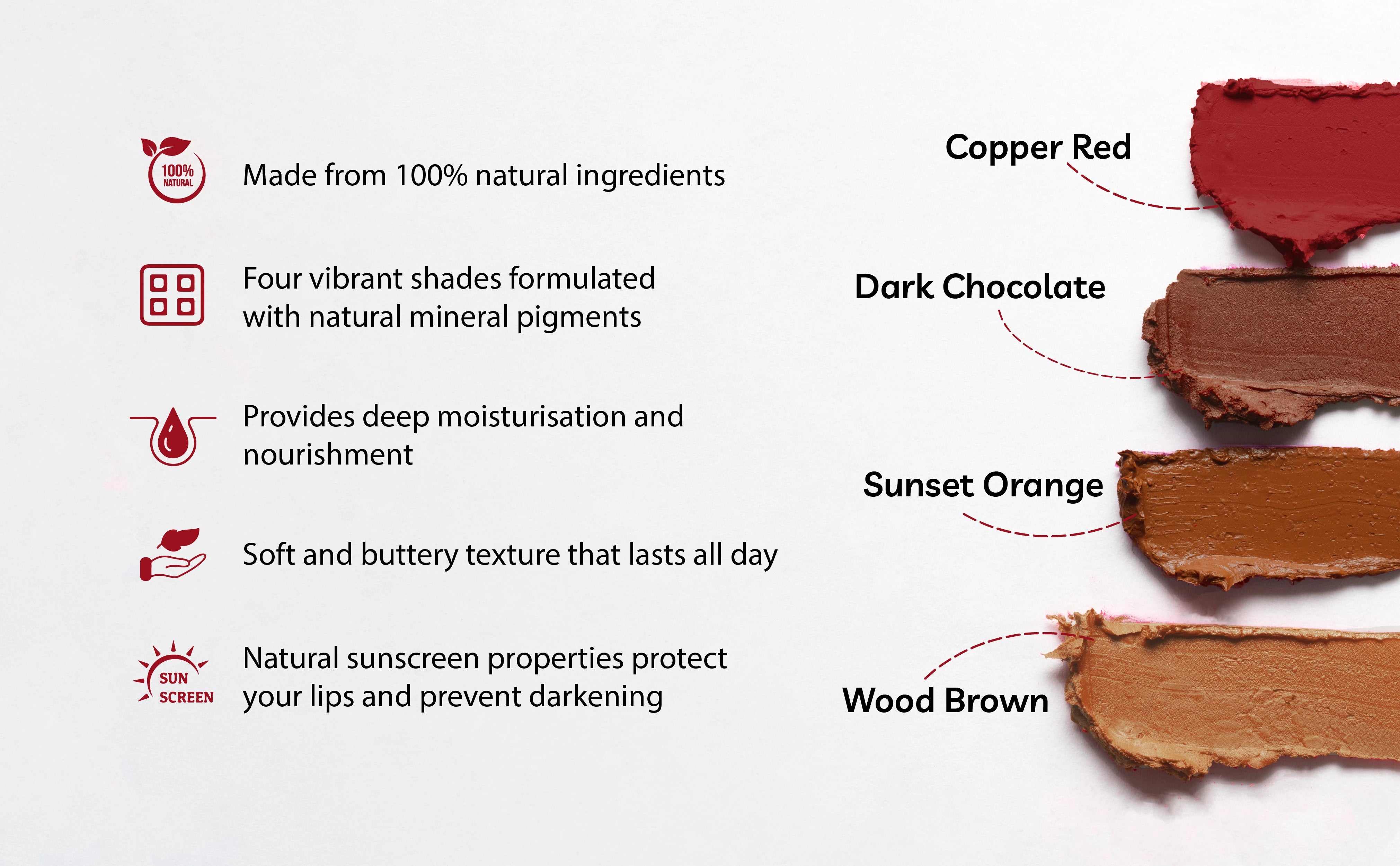 Ricinus Communis Seed (Castor) oil, Cocos Nucifera (Coconut) oil, Cera Alba (Bees wax), Prunus Amygdalus Dulcis (Almond) oil, Butyrospermum Parkii (Shea butter), Garcinia Indica Seed (Kokum) butter, Copernicia Cerifera (Carnauba) wax, Tocopherol (Vitamin E from Sunflower), Mica (and) Iron Oxides CI 77491 (Copper Red) , Iron Oxides CI 77491/92/99 (Wood Brown) , CI 77491/92/99 (Iron Oxides) (Sunset Orange), CI 77491/92/99 (Iron Oxides) (Dark Chocolate)100% Natural origin of total. Ayurvedic Product. For external use only.