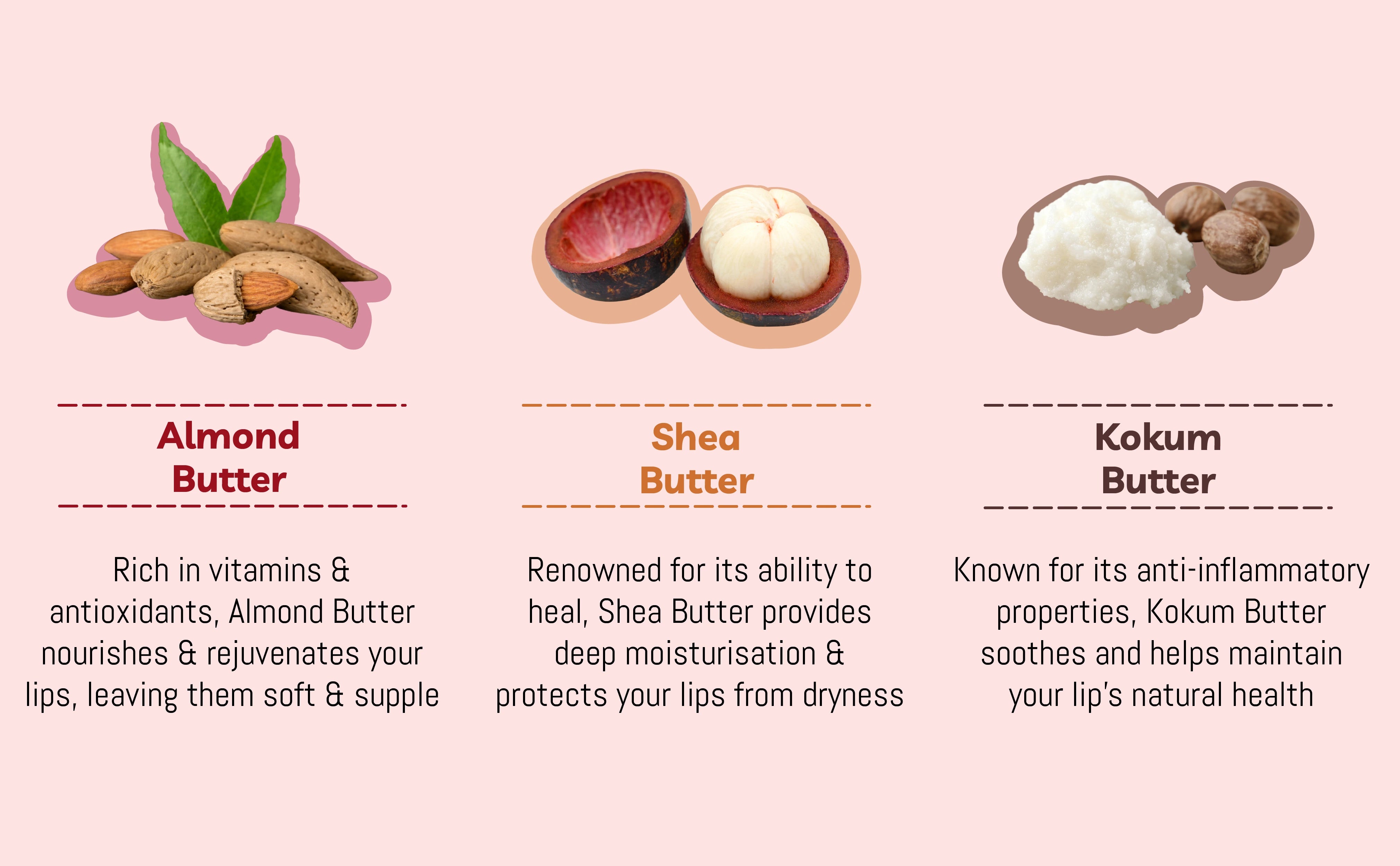 Almond, shea, kokum, beeswax + mineral pigments
