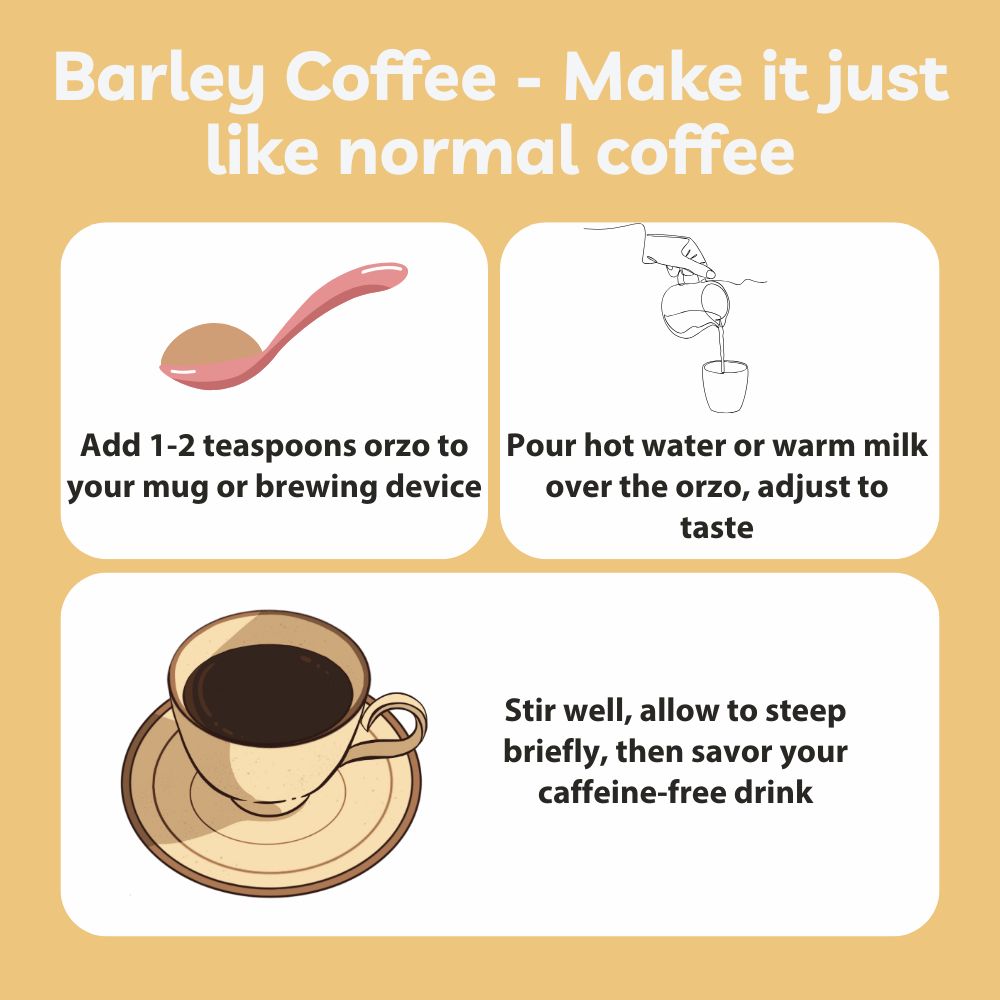 Orzo Barley Coffee: Organic roasted barley, non-GMO soybeans, roots of chicory roasted powdered.