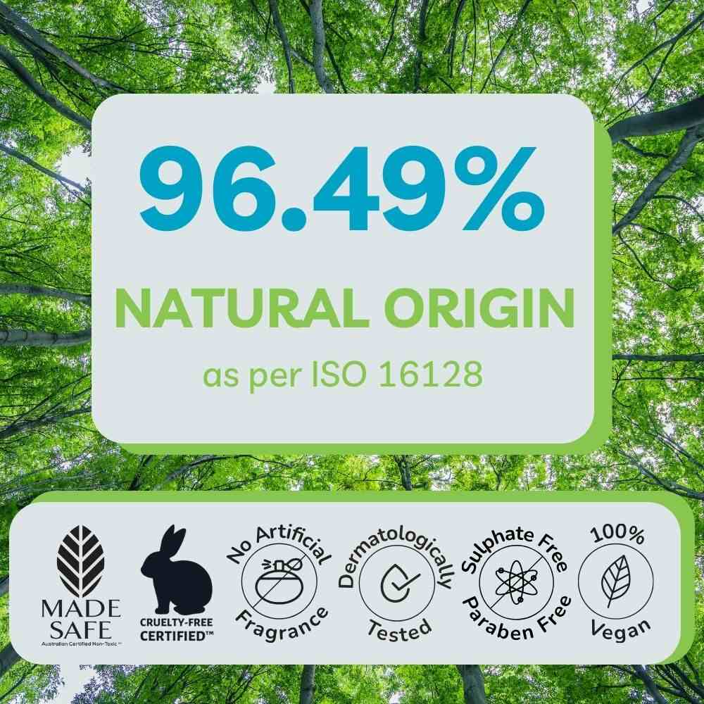 This product is 96.49% Natural origin*. The percentage of non-natural is shown in brackets against respective ingredients: Water, Disodium Cocoyl Glutamate (0.16%), Cocamidopropyl betaine (1.16%), Disodium Cocoamphoacetate (1.14%), Glycerine, Coco Glucoside, Sodium Cocoyl Isethionate (0.42%), Xanthan Gum, Coco-Glucoside (and) Glyceryl Oleate, Panthenyl Hydroxypropyl Steardimonium Chloride (0.25%), Aloe Vera, D-Panthenol (0.2%), Acacia Senegal Gum, Sodium Gluconate, Citric Acid, Licorice Extract. Preservative: Gluconolactone (and) Sodium Benzoate (0.3%). *Rated as per ISO 16128..